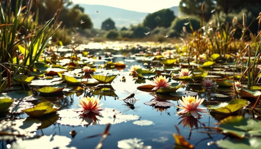 Native plantings. We are establishing white water lily (Nymphaea alba) in the deeper zone and marsh pennywort (Hydrocotyle vulgaris) along the margins, alongside endemic Algarve species including Thymus lotocephalus (a rare native thyme) on the dry edges. Reed beds provide structure for invertebrates and nesting sites.