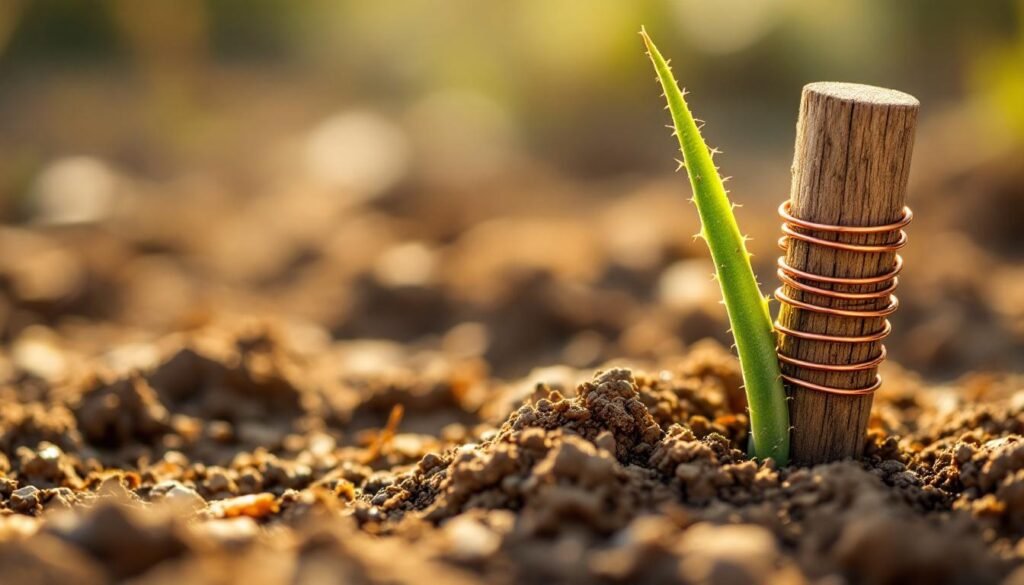 Within the aloe cultivation area, we have designated a demonstration plot for electroculture — an experimental agricultural practice that uses copper antenna poles to harvest atmospheric energy and direct it into the soil. The technique dates back to 1920, when French researcher Justin Christofleau patented a system of copper wire antennas designed to capture what he called “etheric energy” and channel it to plant roots.